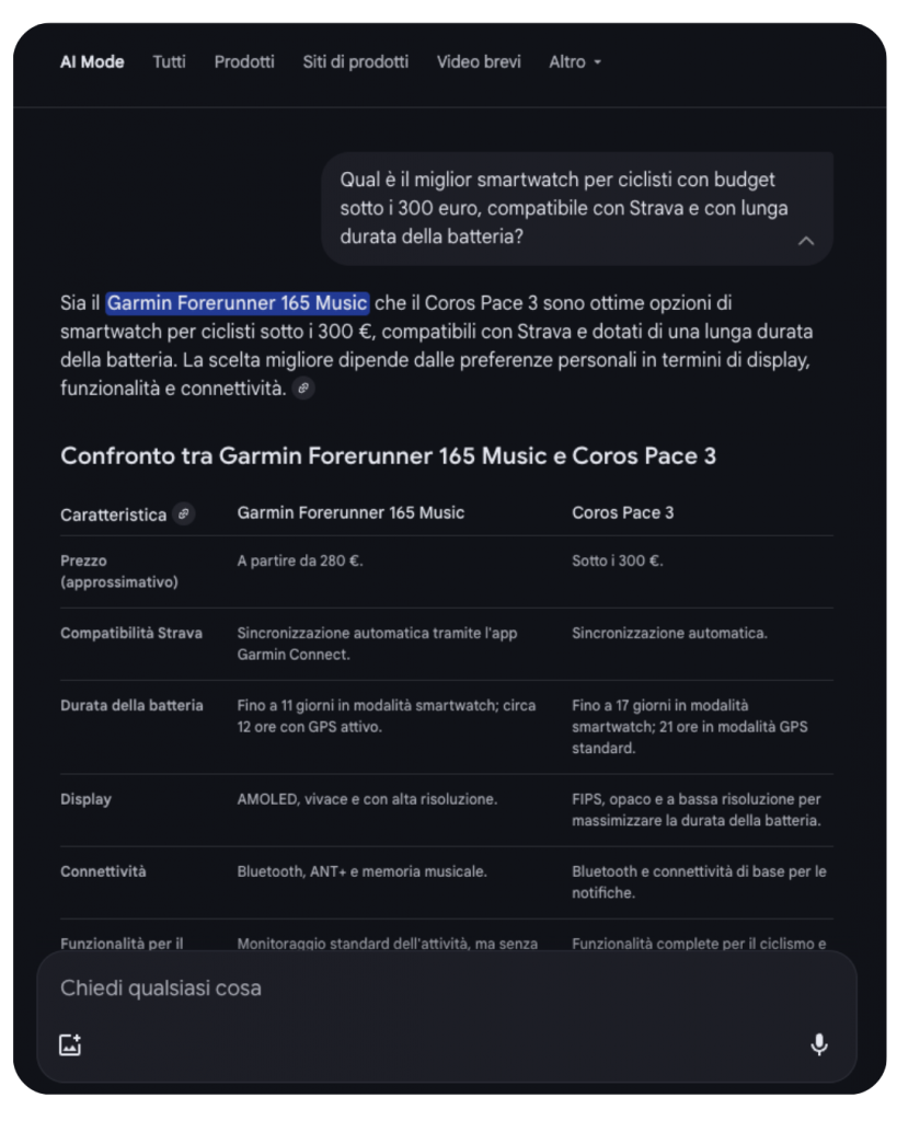 Esempio: “Qual è il miglior smartwatch per ciclisti con budget sotto i 300 euro, compatibile con Strava e con lunga durata della batteria?”.